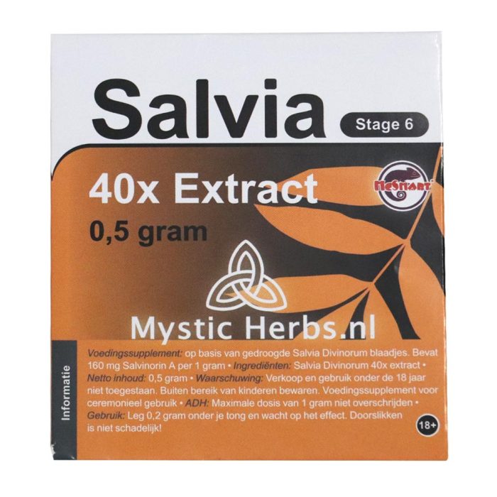- Ingrediënten: Salvia Divinorum 40x extract, bevat 160 mg Salvinorin A per 0,5 gram