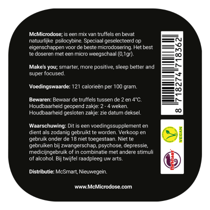 Magic Truffels bevatten van nature ook de stoffen psilocybine en psilocine. Psilocybine en psilocine zijn hallucinogenen. Hallucinogenen zijn stoffen met een bewustzijnsveranderende werking, die hallucinaties kunnen opwekken. Houdt bij consumptie van Magic Truffels dus ernstig rekening met de werking van deze stoffen en bewaar Magic Truffels soort vanwege deze stoffen ook altijd buiten bereik van kinderen!